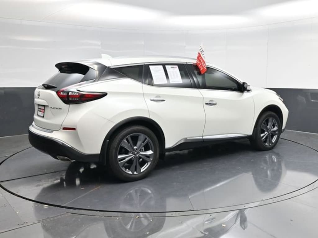 White 2023 Nissan Murano Platinum FWD CVT with Xtronic 3.5L V6 DOHC 24V CVT with Xtronic, Blind Spot Warning, Cargo Area Protector, Cargo Net, Cargo Package, First Aid Kit, Front dual zone A/C, Navigation system: NissanConnect Navigation, Power driver seat, Power Liftgate, Power moonroof, Rear Bumper Protector, Retractable Cargo Cover.