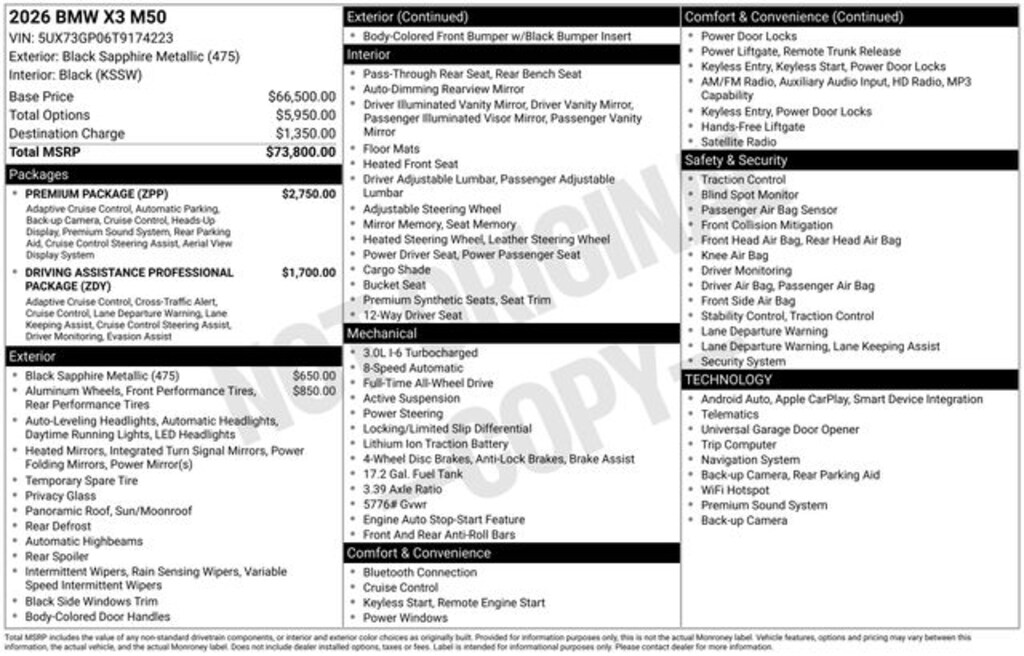 8-Speed Automatic, 12 Speakers, 4-Wheel Disc Brakes, ABS brakes, Adaptive suspension, Air Conditioning, Alloy wheels, AM/FM Radio, AM/FM radio: SiriusXM, Apple CarPlay and Android Auto Compatibility, Auto High-beam Headlights, Auto-dimming door mirrors, Auto-dimming Rear-View mirror, Automatic temperature control, BMW Assist ECall, BMW TeleServices, Brake assist, Bumpers: body-color, Delay-off headlights, Driver door bin, Driver vanity mirror, Dual front impact airbags, Dual front side impact airbags, Electronic Stability Control, Emergency communication system: BMW Assist eCall, Exterior Parking Camera Rear, Four wheel independent suspension, Front anti-roll bar, Front Bucket Seats, Front Center Armrest, Front reading lights, Fully automatic headlights, Garage door transmitter, Heated door mirrors, Heated Front Seats, Heated front seats, Heated steering wheel, Hi-Fi Sound System, Illuminated entry, Knee airbag, Leather steering wheel, Low tire pressure warning, Lumbar Support, M Sport Brake with Blue Calipers, Memory seat, Navigation, Navigation system: BMW Maps Navigation, Occupant sensing airbag, Outside temperature display, Overhead airbag, Overhead console, Panic alarm, Passenger door bin, Passenger vanity mirror, Personal ESIM 5G, Power door mirrors, Power driver seat, Power Front Seats, Power Liftgate, Power moonroof: Panoramic, Power passenger seat, Power steering, Power windows, Radio data system, Rain sensing wipers, Rear anti-roll bar, Rear reading lights, Rear seat center armrest, Rear window defroster, Rear window wiper, Remote keyless entry, Security system, SiriusXM with 360L and 1 Year Trial Subscription, Speed control, Speed-sensing steering, Speed-Sensitive Wipers, Split folding rear seat, Spoiler, Sport Seats, Sport steering wheel, Steering wheel mounted audio controls, Tachometer, Telescoping steering wheel, Tilt steering wheel, Traction control, Trip computer, Turn signal indicator mirrors, Variably intermittent wipers, Veganza Perforated and Quilted Upholstery, Wheels: 20" x 9" Front and 20" x 10.5" Rear M Jet Black, Wireless Device Charging, 8-Speed Automatic.